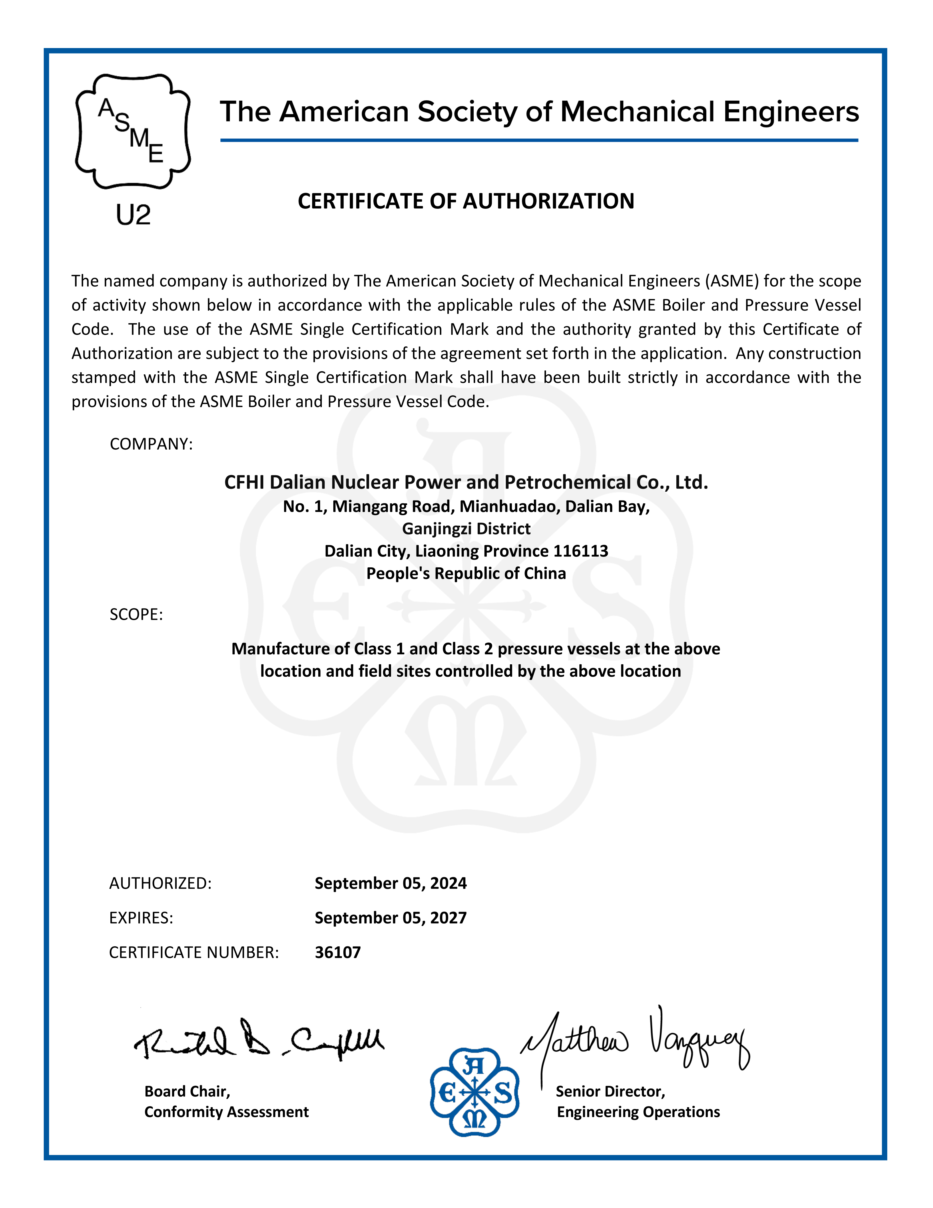 【簡介】該證書是U2授權(quán)證書,由美國機(jī)械工程師學(xué)會(huì)(ASME)授權(quán),公司自1997年8月獲得ASME非核壓力容器制造證書,依據(jù)美國機(jī)械工程師學(xué)會(huì)(ASME)頒布的ASME 標(biāo)準(zhǔn)建立了ASME質(zhì)量保證體系。該證書范圍是制造壓力容器(按ASME第八卷第二分卷)。該證書換證周期為3年,授權(quán)我公司可以按ASME標(biāo)準(zhǔn)和質(zhì)量體系的要求在上述范圍內(nèi)制造壓力容器產(chǎn)品。自取得制造許可以來,制造資質(zhì)