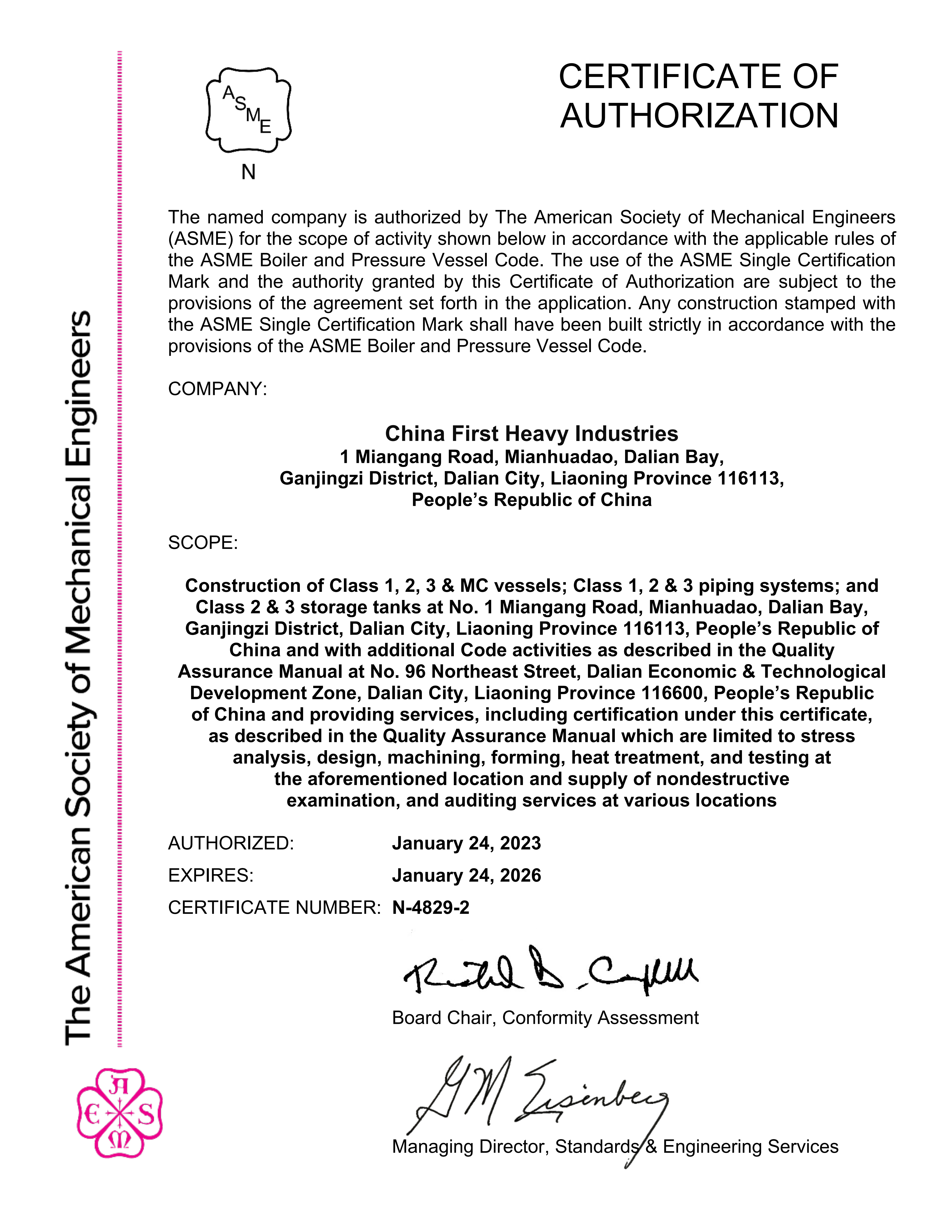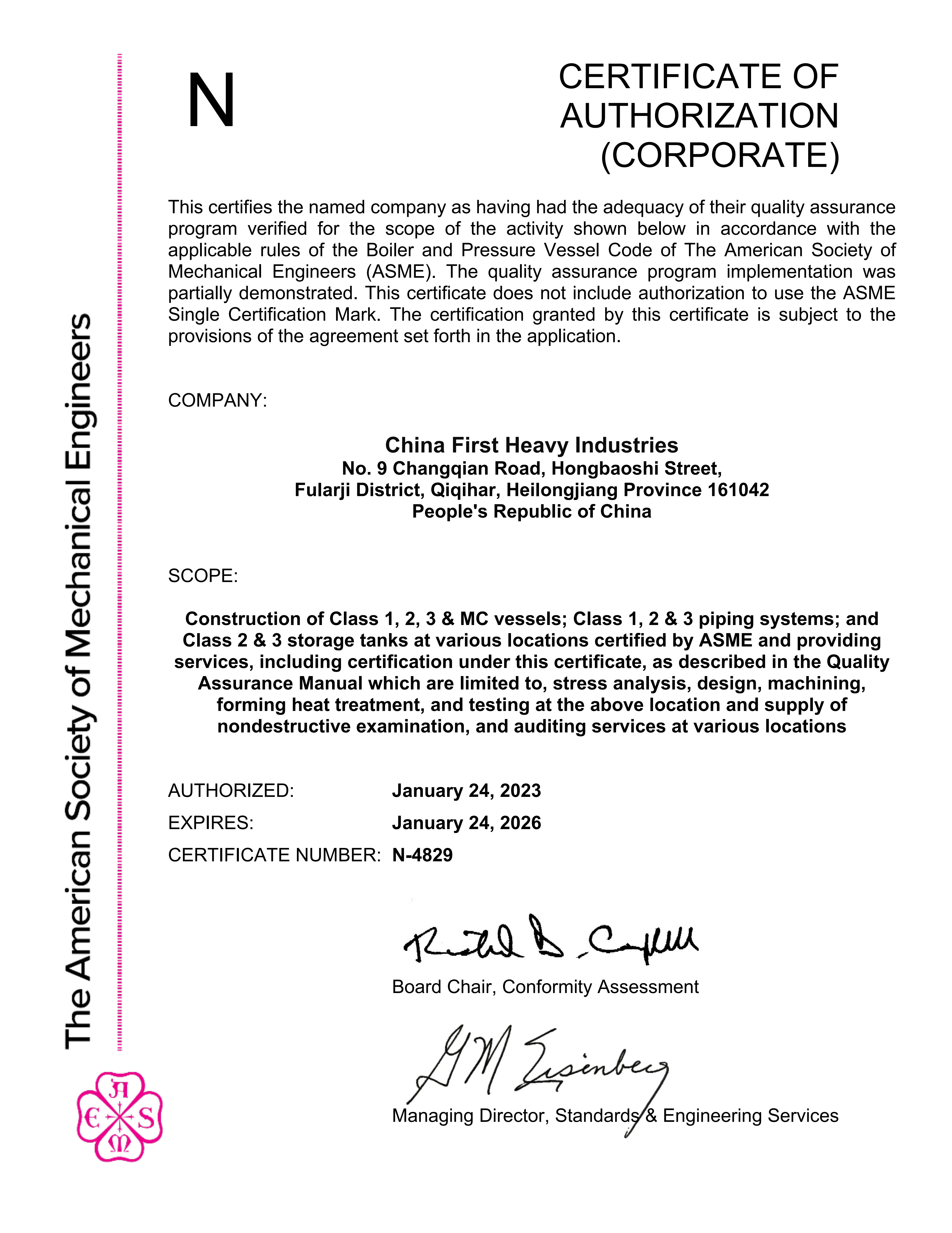 【簡(jiǎn)介】該證書是ASME N 授權(quán)證書,由美國(guó)機(jī)械工程師學(xué)會(huì)(ASME)授權(quán),公司自2008年1月獲得ASME核設(shè)備制造證書,依據(jù)ASME NQA-1 和ASME第三卷NCA分卷建立了ASME核電產(chǎn)品制造質(zhì)量保證體系。證書范圍是核1、2、3和MC級(jí)壓力容器,1、2、3級(jí)管線系統(tǒng), 2、3級(jí)儲(chǔ)罐制造以及1、2、3級(jí)車間裝配。該證書換證周期為3年,授權(quán)我公司可以按ASME標(biāo)準(zhǔn)和質(zhì)量體系的要求在上述范圍內(nèi)制造核電產(chǎn)品和提供材料。自取得制造許可以來,制造資質(zhì)得到