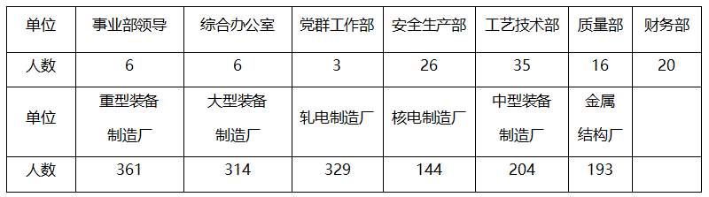 事業(yè)部下設(shè)重型裝備制造廠、大型裝備制造廠、軋電制造廠、中型裝備制造廠、金屬結(jié)構(gòu)廠、核電制造廠等6個(gè)生產(chǎn)及輔助單位和黨群工作部、綜合辦公室、安全生產(chǎn)部、工藝技術(shù)部、財(cái)務(wù)部、質(zhì)量部等6個(gè)職能部門(mén)。截至目前,擁有在崗員工1657人。