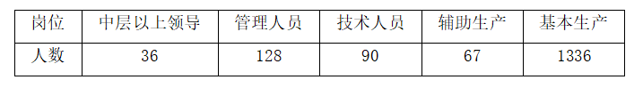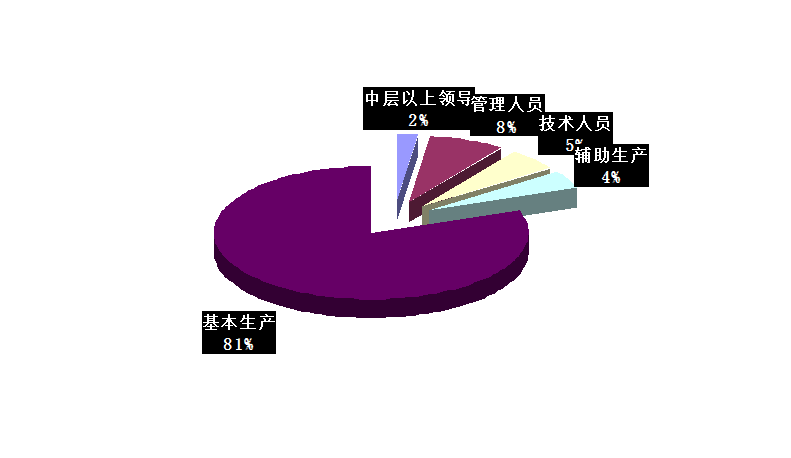 2.從崗位劃分,中層以上領(lǐng)導(dǎo)干部36人,占2%;管理人員128人,占8%;技術(shù)人員90人,占5%;輔助生產(chǎn)67人,占4%;基本生產(chǎn)1336人,占81%。