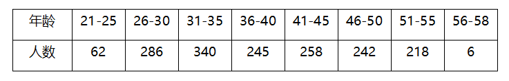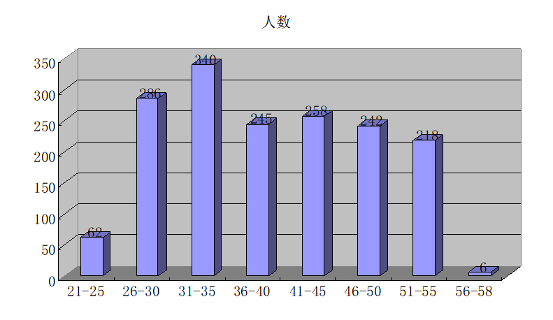 3.從年齡劃分,21至25歲62人,占3.74%;26至30歲286人,占17.3%;31至35歲340人,占20.5%;36至40歲245人,占14.8%;41至45歲258人,占15.6%;46至50歲242人,占14.6%;51至55歲218人,占13.2%;56至58歲6人,占0.36%。