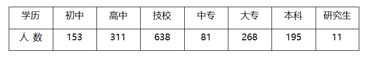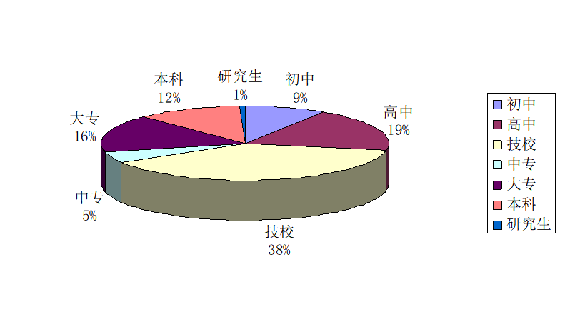 4.從學(xué)歷劃分,初中學(xué)歷153人,占9.2%;高中學(xué)歷331人,占18.8%;技校學(xué)歷638人,占38.5%;中專(zhuān)學(xué)歷81人,占4.9%;大專(zhuān)學(xué)歷268人,占16.2%;大學(xué)學(xué)歷195人,占11.8%;研究生學(xué)歷11人,占0.7%。