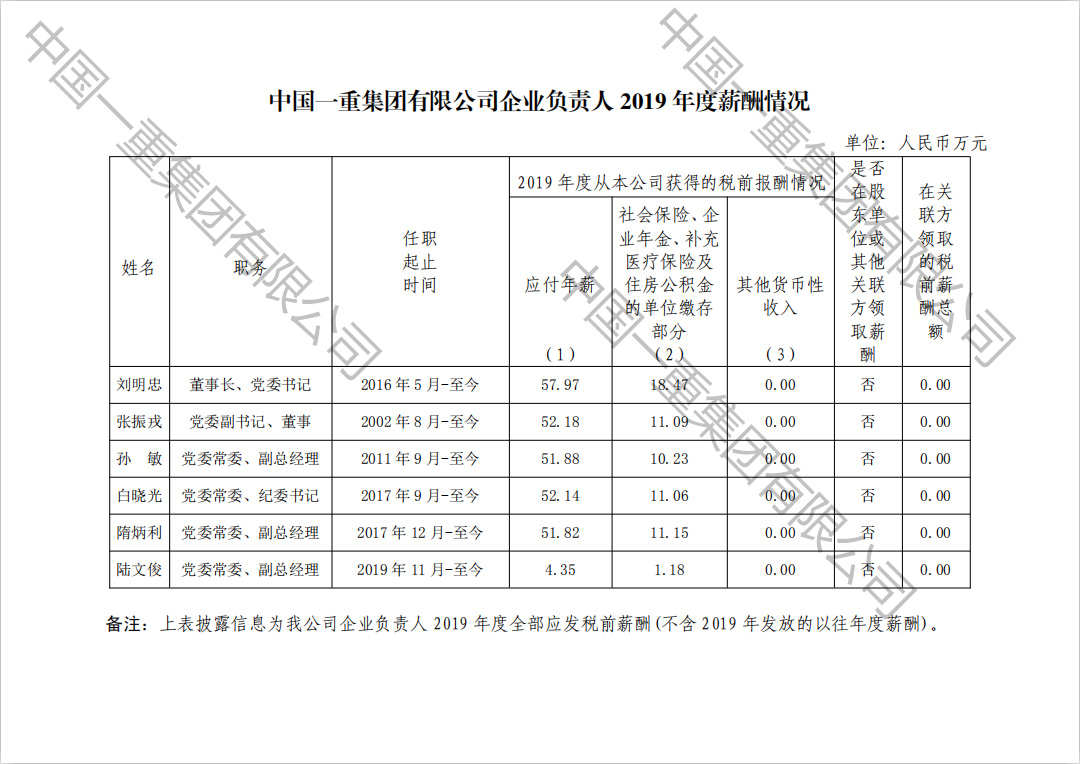 [薪酬公示]中國(guó)一重集團(tuán)有限公司企業(yè)負(fù)責(zé)人2019年度薪酬情況